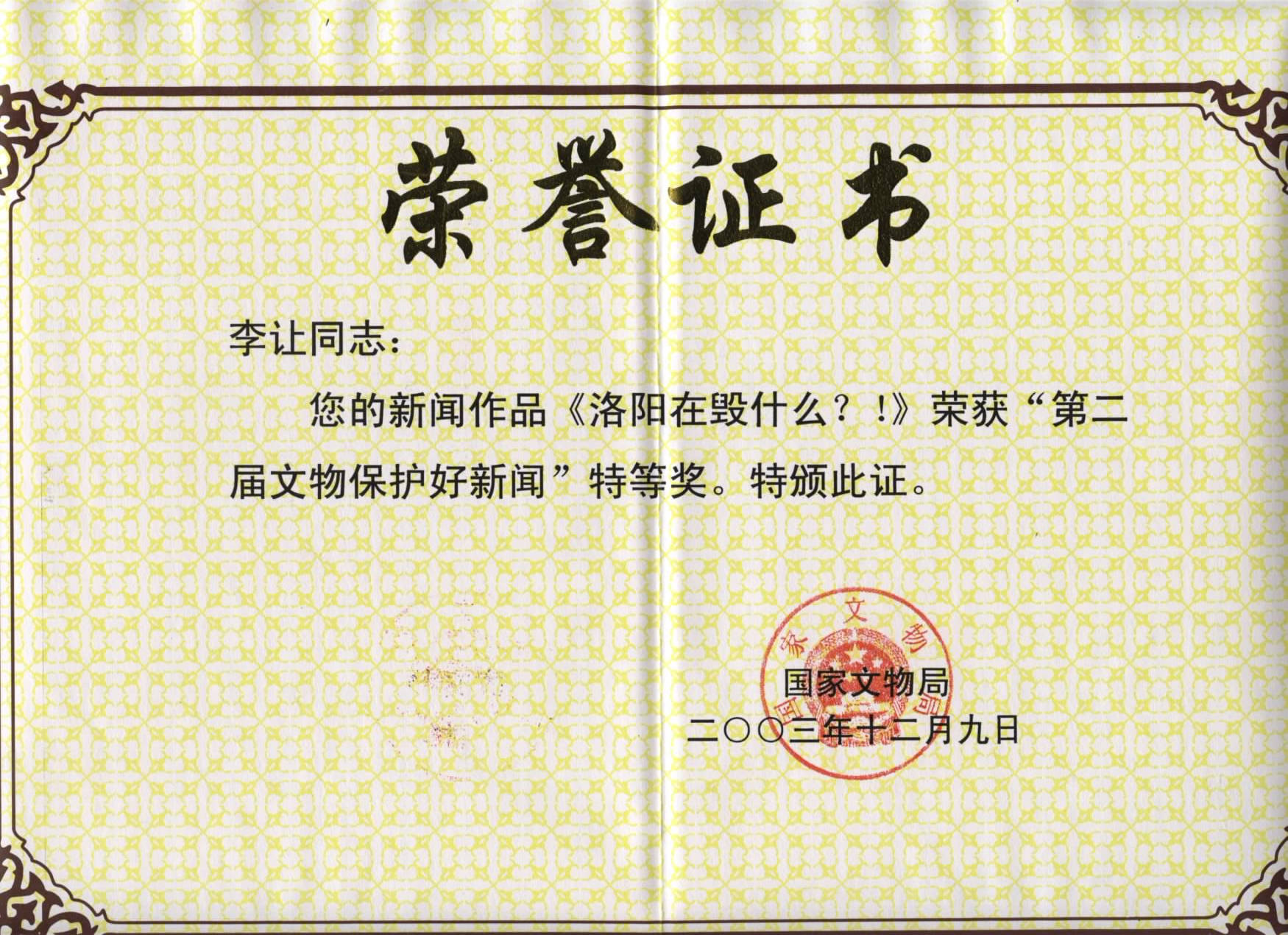 李让“临危受命”,只身前往洛阳现场采访,写出《洛阳在毁什么?!》及后续报道《洛阳,1月16日以后……》,旗帜鲜明地表明坚决捍卫新修订的《中华人民共和国文物保护法》尊严的严正立场。