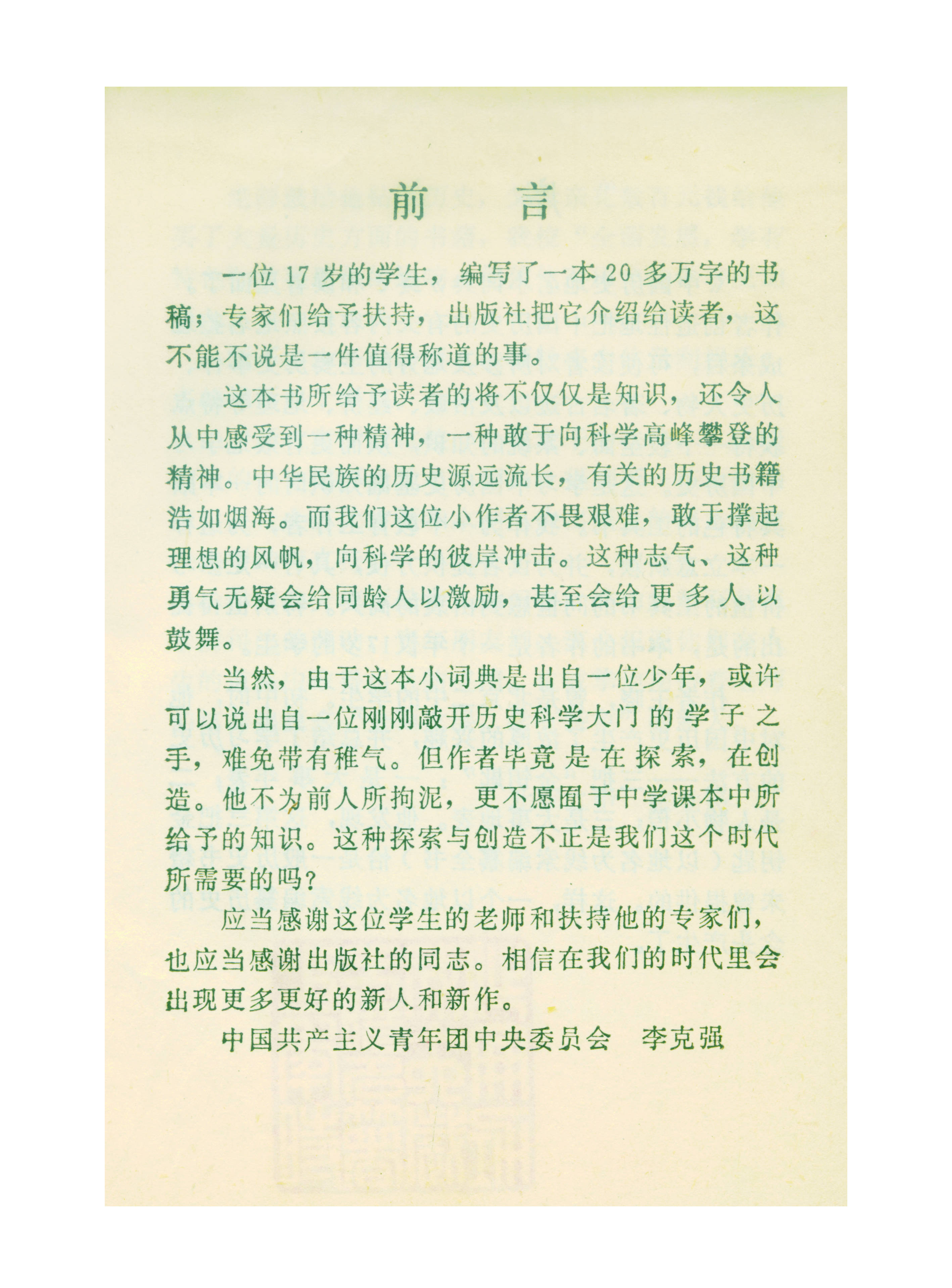 《中国历史小词典》是李让在中国人民大学历史系读书期间完成的,袁宝华校长为这本书亲笔题辞:学习中国历史知识,发扬爱国主义精神。