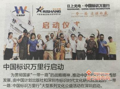为贯彻国家“一带一路”的战略精神,推动中国标识行业向西部发展,由深圳日上光电有限公司冠名的“一带一路:中国标识万里行”大型系列文化公益活动日前在深圳启动。活动车队将从深圳市出发途径广西、云南、西藏、青海、陕西、河南、湖北、湖南等地,探索并发掘古代“丝绸之路”的标识历史符号记忆,促进中国标识行业的产业合作,推动中国标识的规范与完善。
